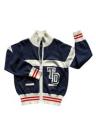 Blue university sweater with red stripes on trim